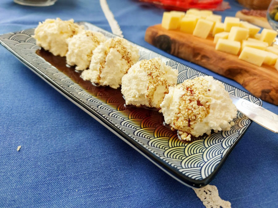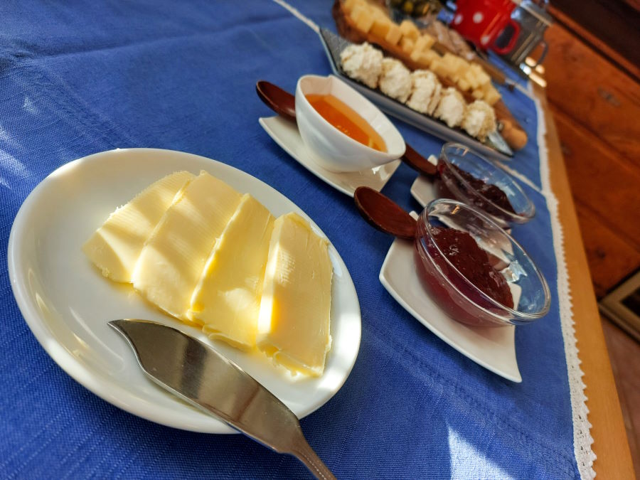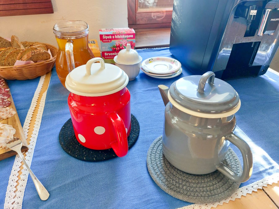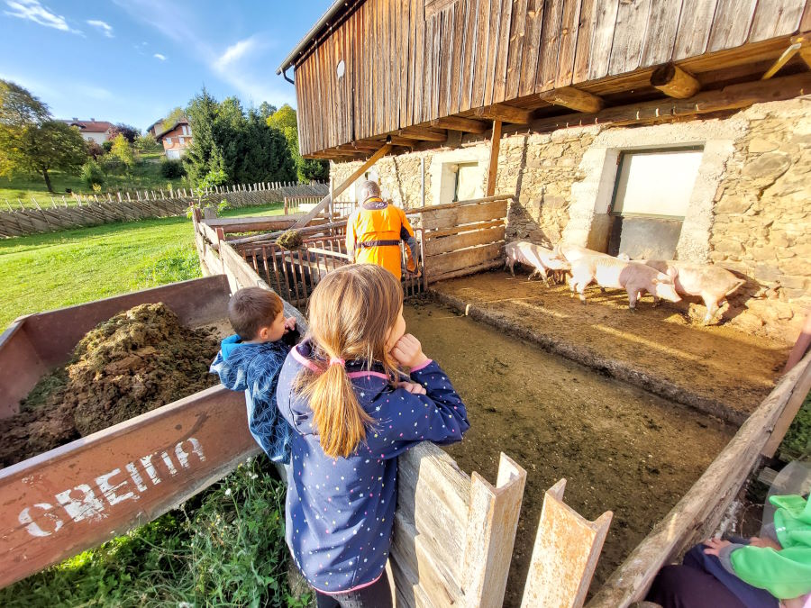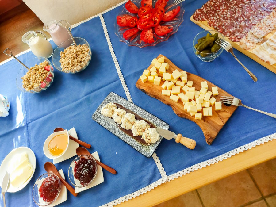 We took advantage of staying at the farm to indulge our taste buds in the morning and evening. The delicious breakfast is definitely a good start to the day. We enjoyed locally produced cured meats, dairy products (cheese, cottage cheese, yoghurt, butter), honey, homemade jams (plum, strawberry), pickles, fresh vegetables (tomatoes, peppers), bread, apple juice, tea, cereals, and scrambled eggs. The evening culinary adventure began with potato and leek soup topped with pumpkin oil, polenta with sour cream, roast meat with onion, porcini mushrooms and courgettes. We washed down the main course with homemade must. The kvocevi nudlni, a sweet local dessert topped with plum jam, vanilla ice cream and coconut cake, was a delicious end to the dinner.