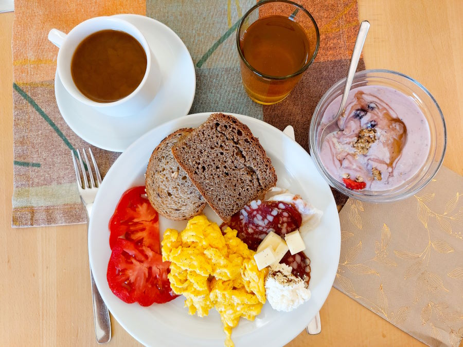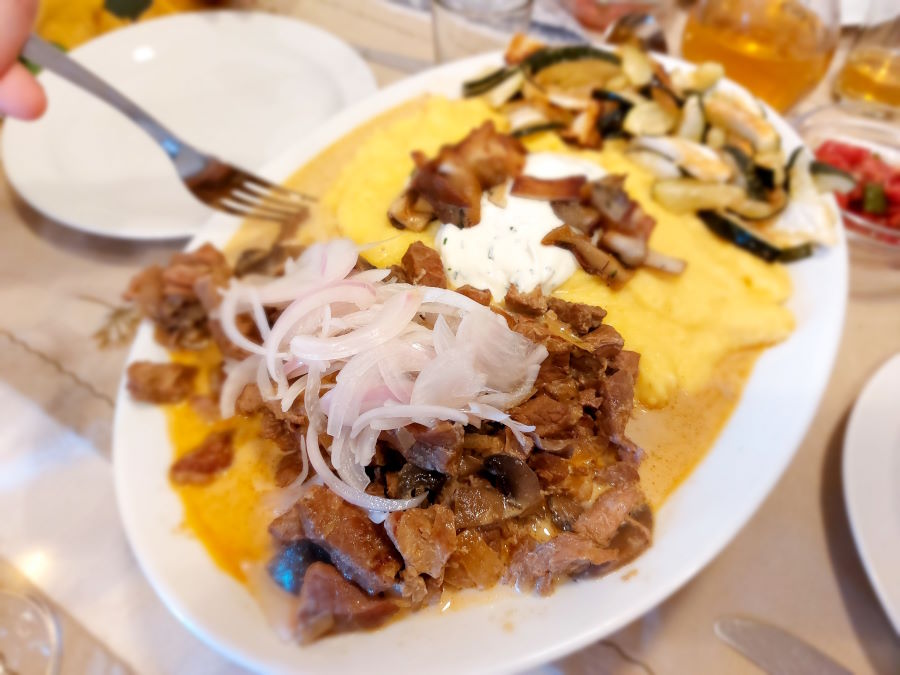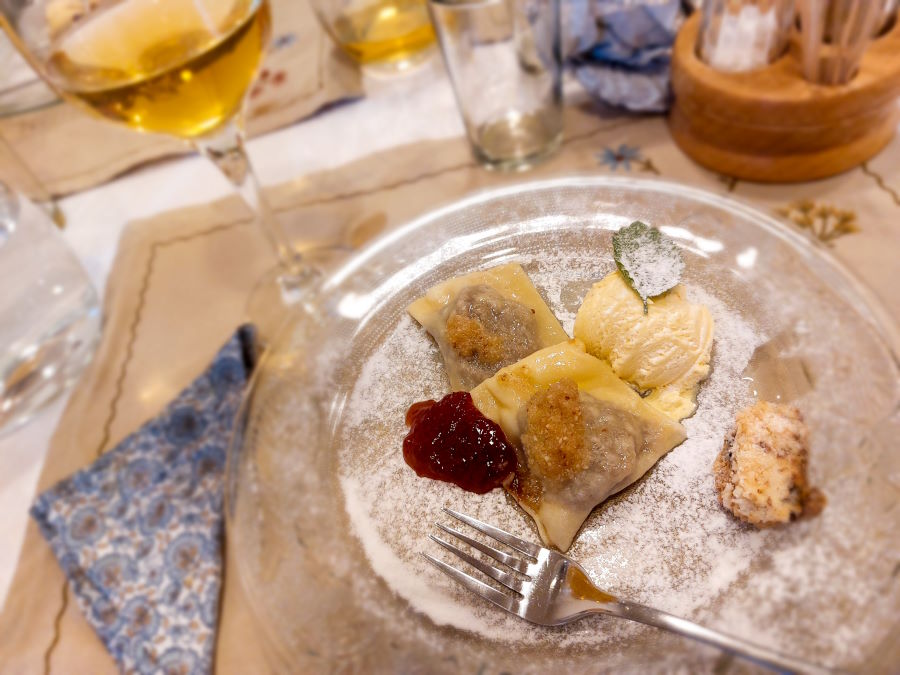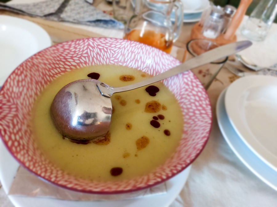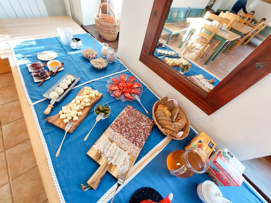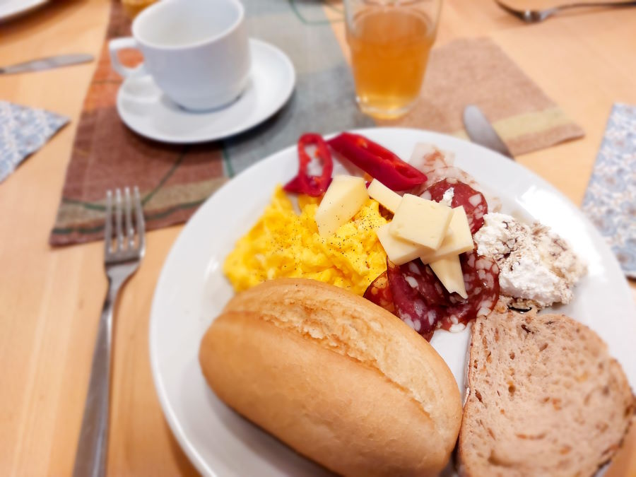 We took advantage of staying at the farm to indulge our taste buds in the morning and evening. The delicious breakfast is definitely a good start to the day. We enjoyed locally produced cured meats, dairy products (cheese, cottage cheese, yoghurt, butter), honey, homemade jams (plum, strawberry), pickles, fresh vegetables (tomatoes, peppers), bread, apple juice, tea, cereals, and scrambled eggs. The evening culinary adventure began with potato and leek soup topped with pumpkin oil, polenta with sour cream, roast meat with onion, porcini mushrooms and courgettes. We washed down the main course with homemade must. The kvocevi nudlni, a sweet local dessert topped with plum jam, vanilla ice cream and coconut cake, was a delicious end to the dinner.