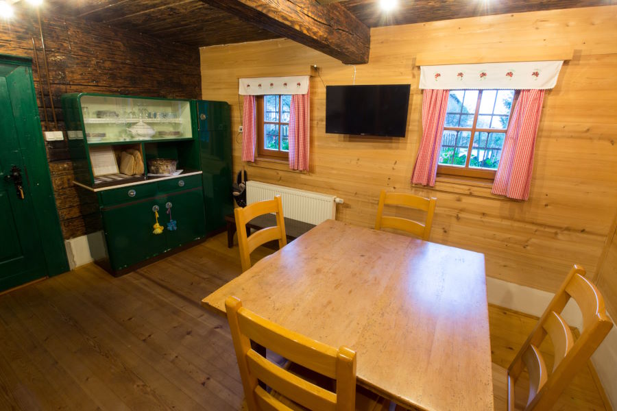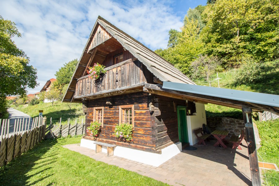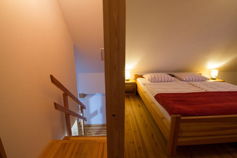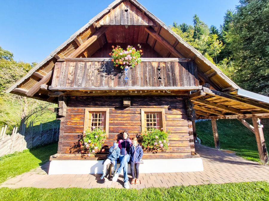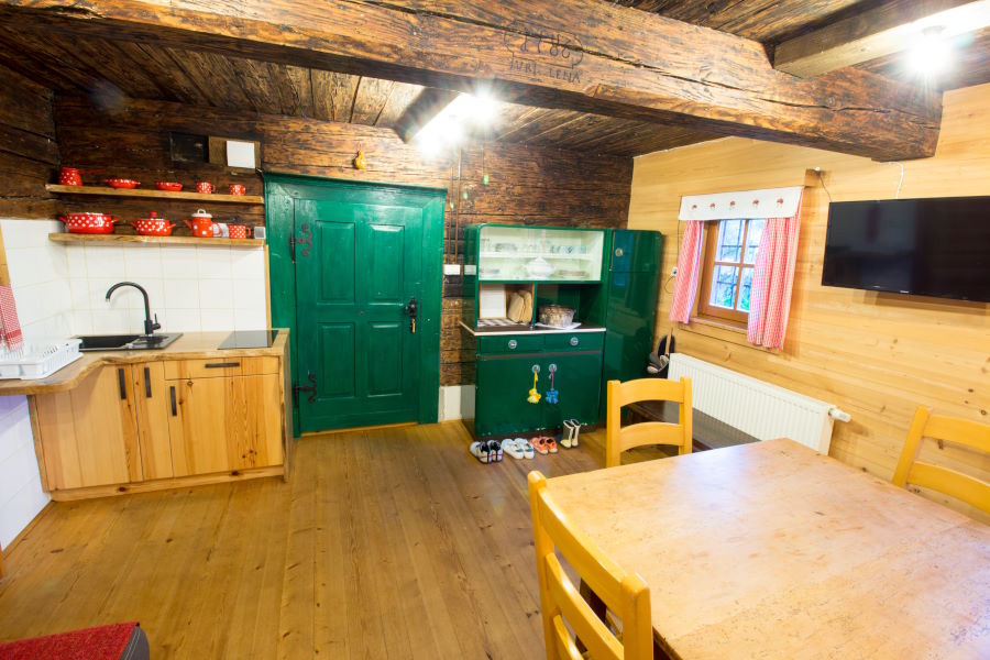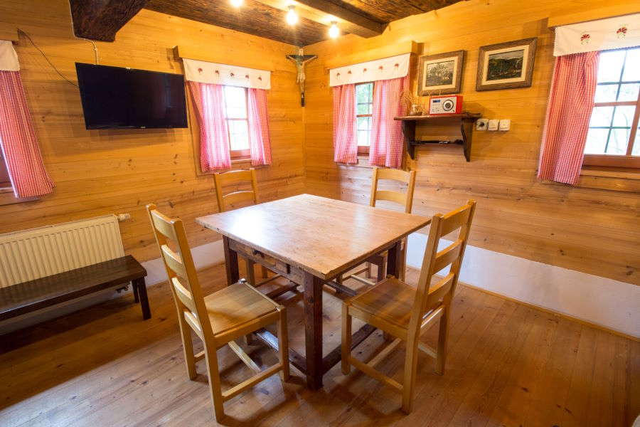 Matevž greeted us at Eco farm Mikl and took us to our fairytale wooden cottage. During the renovation of the old historic house, the engraved signature of Jurij and Lena, the former owners from 1786, was discovered. The entire cottage is decorated in vintage style, using natural materials and restored furniture. On the ground floor, there is a small kitchen with basic utensils, a bathroom with shower and toilet, a dining area, and a living room with a sofa and TV. Wooden stairs lead to the first floor, which has a double sofa bed in the corner and a double bed with access to the balcony. The balcony offers spectacular views of Mount Peca and a fishpond. In front of the house, there is a fenced lawn with a fireplace, sunbeds, and a covered terrace with a table and benches.