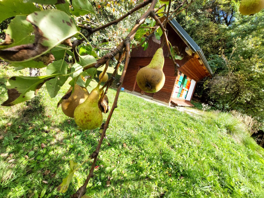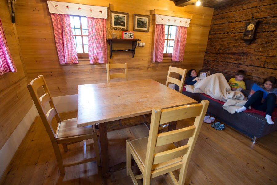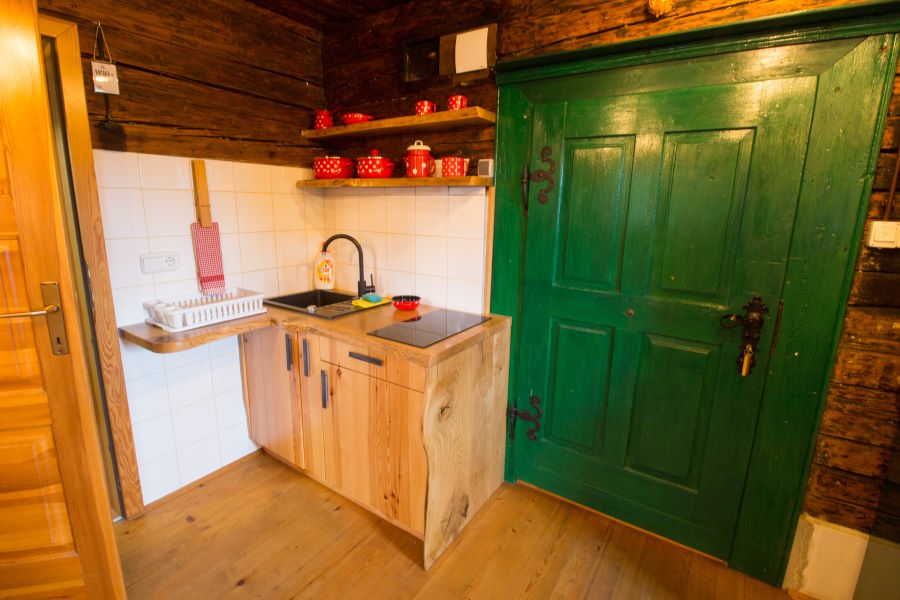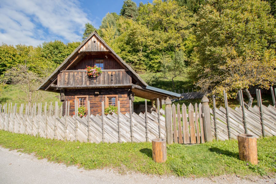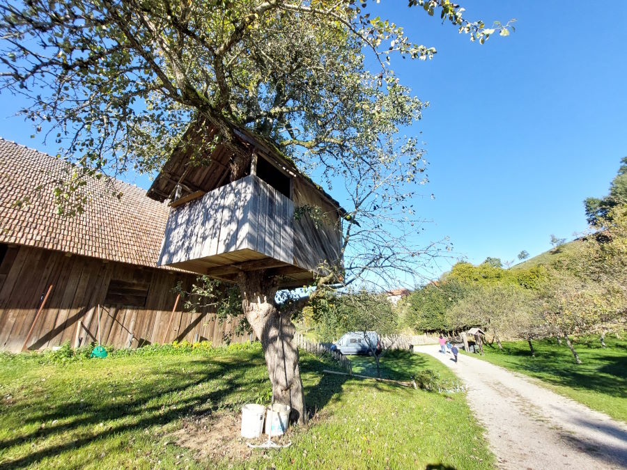 Matevž greeted us at Eco farm Mikl and took us to our fairytale wooden cottage. During the renovation of the old historic house, the engraved signature of Jurij and Lena, the former owners from 1786, was discovered. The entire cottage is decorated in vintage style, using natural materials and restored furniture. On the ground floor, there is a small kitchen with basic utensils, a bathroom with shower and toilet, a dining area, and a living room with a sofa and TV. Wooden stairs lead to the first floor, which has a double sofa bed in the corner and a double bed with access to the balcony. The balcony offers spectacular views of Mount Peca and a fishpond. In front of the house, there is a fenced lawn with a fireplace, sunbeds, and a covered terrace with a table and benches.